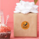 Pegatinas divertidos con un colorido ilustracion original de una bruja volando frente a una luna llena en una escoba con un gato negro y una linterna Jack-o'. ¡Mucha diversión en la fiesta de Halloween! Fondo naranja.