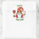 En este pegatina hay un elfo gnomo adorable vestido con un sombrero de Santa Sat de reno rojo y dorado. Sostiene con una mano una copa de vino de Santa Claus y una lata de caramelo de rayas rojas y blancas por la otra. El texto verde de arriba abajo dice "FELIZ AÑO NUEVO".