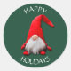 Este divertido pegatina de vacaciones presenta una linda imagen de un pequeño gnomo blanco barbudo con un sombrero rojo de Santa que se le cae por los ojos. Arriba y debajo de la imagen hay campos de texto personalizados que actualmente dicen "Felices Fiestas". Cute por correspondencia, tarjetas y muchos proyectos de vacaciones.