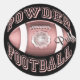 Fútbol Puff en polvo. Fútbol rosa con letras de estilo universitario que deletrean "Polvo" y "Fútbol" en la parte superior e inferior, respectivamente, y la palabra Puff en letra de guión en el fútbol. El fútbol está grabado en relieve con un polvorín en el medio.