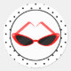 Pegatina con antecedentes de pequeños puntos negros de polka sobre blanco. Gafas de sol de ojos de gato rojo retro dentro de círculo en el centro.