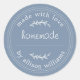 Pegatina de tarro de mermelada o productos horneados caseros rústicos con el texto casero, hecho con amor y su nombre en tipografía moderna sobre un fondo azul denim. Simplemente agregue su nombre a la etiqueta. Puede escribir los nombres de los productos en las pegatinas cuando se realicen los productos. Diseñado exclusivamente para usted por Happy Dolphin Studio. Si necesita ayuda o productos coincidentes, por favor contáctenos en happydolphinstudio@outlook.com.
