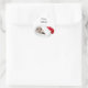 Un gatito torbie de pelo largo en un gorra de Santa Claus se asoma porque sabe que Papá Noel viene pronto foto pegatina de Navidad. El texto puede cambiarse o eliminarse fácilmente
