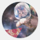 Pegatina Redonda Gato astronauta cazando una porción de pizza