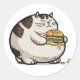 Un gato gordo comiendo una pegatina de hamburguesa probablemente presentaría una imagen personalizado o ilustrada de un gato con un gran vientre redondo que consume una hamburguesa. El gato podría verse sentado en posición vertical, sosteniendo la hamburguesa en sus garras, y su boca podría ser ancha mientras se muerde. La hamburguesa puede tener ingredientes como lechuga, tomate, queso, ketchup o mostaza, y puede haber grasa o migajas visibles en la cara o las patas del gato. El pegatina puede estar diseñado para su uso en artículos como portátiles, botellas de agua o portátiles.