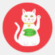 Esta impresionante hoja de pegatinas presenta una imagen de diseño gráfico de un afortunado gato oriental blanco ondulado. El gato tiene hermosos ojos de oro y lleva puesto un medallón de oro en el cuello. El gato tiene orejas y bigotes rosas. Este lindo gatito sostiene una ficha de oro con entrada de jade verde y un mensaje en texto dorado que dice "Buena suerte".