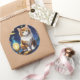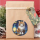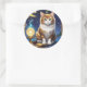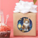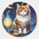 Un marco mágico rodea a un gato marrón y blanco sentado en un libro de hechizos cerca de una lámpara mágica con estrellas en el fondo.