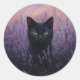 Pegatina Redonda Gato negro en un Ilustracion de campo de lavanda