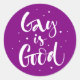 Esta obra de arte incluye texto de guión con la frase "Gay is Good".