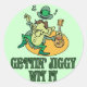 Un irlandés vestido con un traje verde y llevando un violín y bailando una jig con la leyenda Gettin' Jiggy Wit.
