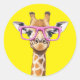 Pegatina Redonda Girafa con lentes rosados de fondo amarillo. Pegat