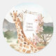 Añada un adorable tema de safari personalizado a la fiesta de cumpleaños o la ducha de bebé de su niñita o niño con este pegatina de jirafa color bonito. Pegatina tiene una jirafa frente a un fondo de sabana africana. También hay flores y un lugar para tu texto personalizado. ¡Hace una linda adición personalizada a una celebración!