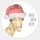 Pegatina de Navidad con una jirafa graciosa en un sombrero rojo de Santa. El texto dice: "Ho, Ho, Ho"