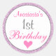 El purpurina morado Girly y glam lilac brilla por su primer cumpleaños al pegatina redondo clásico con escritura rosa caliente y gris. Puede añadir fácilmente el nombre de su elección y cambiar el color y el tipo de letra utilizando la opción personalizar.