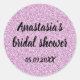 Pegatina redondo personalizado para una ducha de novia. Este pegatina glam presenta una elegante escritura negra y un purpurina lila púrpura respira el fondo. Puedes personalizarlo con tu nombre y fecha de ducha de novia. Incluso puede cambiar el color de texto y el estilo de fuente mediante la opción personalizar.