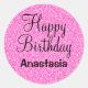 Pegatina Redonda Glam Happy Birday Hot Pink Purpurina Sparkle Name
