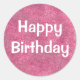 Feliz Cumpleaños pegatina con brillantes purpurinas de oro rosa morado y aguda escritura blanca.