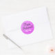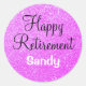 Pegatina redondo clásico de glam Happy Retirement personalizado con un fondo brillante purpurina morado y escritura en blanco y negro. Puede agregar fácilmente el nombre de su elección y cambiar el color y la fuente del nombre utilizando la opción personalizar.
