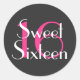 Monograma blanco y rosa caliente de Glam personalizado Sweet 16 Dieciséis pegatinas redondos clásicos. Este pegatina bonito presenta un gran rosa caliente de "16" y las palabras "Sweet Sixteen" (Dieciséis dulces) en blanco.