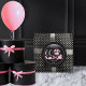 El diseño de 60 años, rosa y negro, inspirado en la moda francesa, presenta un diseño de estilo Art Déco Glamoroso, con un pastel de caja gorra, un estilete rosa y una bolsa de maquillaje entre varios regalos de cumpleaños sin abrir y deliciosos pastelitos. Perfecto para celebrar fiestas de cumpleaños. La edad se crea en un tipo de letra falso purpurina rosa.
