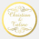 Un pegatina redondo elegante y elegante con un Relieve metalizado de oro falso, florece sobre un fondo blanco, delineado con un borde dorado clásico. Haga clic en el botón IT PERSONALIZAR para agregar el texto. Viene con 5 colores. Coincidiendo con las invitaciones de los bodas, guarde las fechas, las tarjetas de mesa, los RSVPs, las servilletas de cóctel, las galletas y más disponibles. Para preguntas o solicitudes de otros artículos que presenten este diseño, por favor contacte con: cheryl@cheryldanielsart.com. "Swirly Flourish with Frame" por Cheryl Daniels © 2015.