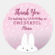 Cute sticker de glitter rosa para agradecer en la primera fiesta de cumpleaños de una niña. Diseñado con tonos rosa suave, lunares blancos, falso glitter brillante y un dulce mensaje de “ONEderful”. Cuenta con un conejito invernal asomando desde la parte inferior para un toque juguetón de temporada. Ideal para regalos de fiesta de Onederland de invierno, bolsas de regalos o sellos de sobre. Totalmente personalizable con el nombre de tu bebé y los detalles de la fiesta.