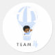 Esta divertida pegatina presenta a un bebé afroamericano en un globo aerostático de color azul bebé, saludando desde las nubes. Es un diseño encantador para eventos de revelación de género y decoraciones con tema de bebé. El texto es editable para que puedas personalizarlo para cualquier ocasión.