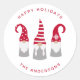 Sencillo y lindo pegatina de vacaciones de estilo nórdico con tres lindos gnomos escandinavos Navidades con gorras rojos de temporada y túnica gris. Puedes personalizar un "Feliz feriado, "Feliz Navidad", etc., saludo y tu nombre en una simple tipografía moderna.