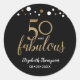 "50 and Fabulous" qué cumpleaños tan importante. Personaliza este pegatina de moda redonda con confeti dorado y blanco sobre negro. Incluya el nombre y la fecha del fiesta de todos los celebrantes, busque los suministros de fiesta coincidentes de esta colección. *el efecto oro es un gráfico impreso
