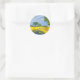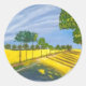 Golden Fields and Path captures a peaceful countryside road where vibrant yellow fields meet deep, long tree shadows under a soft blue sky.