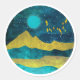 Resumen de diseño de paisajes montañosos en tonos audaces de oro, cian y azul con un amanecer, estrellas y pájaros.