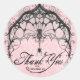Esta Halloween Gracias pegatina tiene una telaraña de estilo gótico con una araña negra en un fondo de damasco rosa. El texto dice "Gracias por dejarte caer".