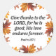 Sumérgete en el espíritu de la gratitud con nuestra colección de Dar gracias, inspirada en la eterna verdad de Salmo 107:1, "Danos gracias al Señor, porque Él es bueno; Su amor perdura para siempre". Esta colección sirve como un recordatorio sincero de la constante bondad de Dios y del amor ilimitado. Cada elemento está diseñado de manera reconfortante para ayudarte a expresar tu agradecimiento y compartir este poderoso mensaje con otros. Ya sea que estés adornando tu casa, bendiciendo a un ser querido con un regalo, o buscando el estímulo diario, la Colección de Danos Gracias se crea para levantar tu espíritu y mantener tu corazón centrado en la eterna bondad de Dios.