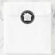 Celebra tu nuevo hogar con estilo con estos pegatinas/sellos para sobres de la etiqueta de favores redondos personalizados. Todo el texto es sencillo de personalizar. El diseño en blanco y negro presenta una silueta de casa minimalista moderna de moda, una cita de amistad inspiradora en círculo y nombres de tipografía de escritura personalizados en el centro. El diseño moderno y elegante le da un toque final elegante a sus invitaciones, favores o notas de agradecimiento. La cita dice: "Los ornamentos de nuestra casa serán los invitados que la frecuentan".