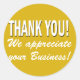 Gracias Agradecemos su negocio en blanco sobre fondo dorado disponible en botón, pegatina o imán. Que los empleados usen el botón para agradecer a sus clientes y hacerles saber que son apreciados incluso si estás demasiado ocupado para decírselo a cada persona. O use el pegatina en sus facturas u otra correspondencia especial.
