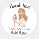 Di gracias a amigos y familiares por asistir a tu celebración con una madre tierra boho tranquila y serena con cabello castaño largo que ofrece un ramo de corazones como agradecimiento por venir a celebrar con nosotros. El nombre, evento y fecha se pueden personalizar para un hermoso diseño de etiqueta personalizada y hace una adición considerada y personalizada a cualquier configuración de mesa en tu próximo baby shower, fiesta de cumpleaños, despedida de soltera o reunión.