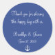 Gracias pegatinas de bodas náuticas azules con texto de ancla y personalizable