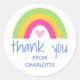 Muestra tu agradecimiento con esta pegatina elegante para una fiesta de cumpleaños. Un diseño adorable con un arcoíris colorido sobre un corazón, personalizado con el nombre de un niño. Esta plantilla personalizada es ideal para los regalos de las fiestas de los niños, sellos de sobre, o para fijar cintas y etiquetas a los paquetes. Perfecto para agradecer a los invitados en las fiestas de cumpleaños infantiles. Colores impresos: verde, amarillo, rosa, azul y blanco. ¡Explora la colección en línea para obtener más ideas de productos populares para las celebraciones de cumpleaños infantiles!