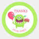 Personalice este pegatina de agradecimiento con su propio texto. Pequeño diseño monstruo en verde y rosa con torta de cumpleaños y un globo.