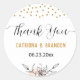 Pegatina Clásica Redonda de Flores Modernas Rosa y Negro con Puntos Dorados Tarjeta de invitación de boda con confeti moderna que presenta lirio negro, puntos de confeti dorados y rosa suave. Tarjeta contemporánea elegante y glamurosa con rosa dorado.