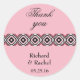 Pegatinas de estilo geométrico moderno rosado con fondo fucsia, un estilo geométrico rosa y negro recorre el centro. "Gracias" escrito con letra cursiva negra y debajo del patrón está el nombre de la pareja y la fecha del boda. ¡Haga su pedido hoy mismo! Diseño pegatina: Bodas de arte de Rhoadie: AMBilustraciones http://www.etsy.com/shop/AMBillustrations/