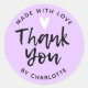 Una lavanda personalizada morada de 1/2 pulgadas "hecha con amor, gracias" pegatina en un fondo de color rojo. Hazlo tuyo añadiendo tu propio nombre. Un toque de bonito para todos tus regalos hechos a mano y caseros. Viene también con un tamaño de 3 pulgadas. Perfecto para agradecer a los clientes en su negocio de artesanía casera. Diseñado para ti por Blackberry Boulevard.