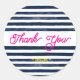 "Gracias pegatinas con un tema de rayas de la marina de moda, adornado con vibrante texto rosa y amarillo. Estos pegatinas están diseñados para ser personalizables, lo que le permite modificar el texto para adaptarlo a sus necesidades. ¡Ideal para añadir un toque elegante y personal a sus envases, regalos o ocasiones especiales!"