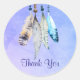 Gracias pegatina con un diseño de acuarela con temática norteamericana. Un diseño acuático con cuatro delicadas plumas suaves y adornadas desde el borde superior. El fondo es una suave textura de color azul violeta. Un motivo tribal con un tema de estilo americano nativo.