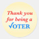 "Gracias por ser votante" se muestra en rojo brillante y azul en un fondo de gradiente soleado; la "V" es una marca de verificación. Perfecto para entregar a los votantes o para su campaña de escritura con postales para llegar a los votantes. El diseño es mejor en pequeños tamaños redondos o cuadrados, que se presentan en hojas de 20. ¡Asegúrate de que tú y tus amigos estén registrados y voten!