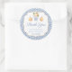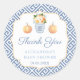 Gracias pegatinas por cualquier evento (mostrado aquí para un Baby Shower pero todos los campos de texto son personalizables). El diseño incluye un jarrón de jengibre azul y blanco lleno de flores naranjas y blancas flanqueado por calabazas acuarelas a cada lado. El fondo es un patrón de clave griega azul y blanco.