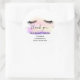 Pegatina para la promoción de la reapertura de su salón de belleza, negocio, o para un maquillador después de Covid-19, el virus de la corona. Un fondo blanco con brocas pintadas en tonos pastel claros, con pinceladas rosa, violeta, amarilla, de imitación de oro. Decorado con pestañas negras. En el frente: El texto: Gracias escrito con un guión escrito a mano a la moda y con perchas. Personalice y agregue su nombre, dirección e información de contacto. Perfecto para favores, regalos, promoción / publicidad de su negocio.