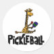 La jirafa divertida de Cute está sosteniendo la pelota de pickleball y remo por encima de las letras de pickleball artísticas.