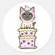 Pegatina Redonda Gracioso gato siamés saltando de un pastel