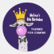 Cumpleaños gracias pegatina con una llama caprichosa que sopla una burbuja rosa mientras mastica goma de mascar. Llevando una corona de oro y una corbata de arco negro. Fondo morado oscuro.
